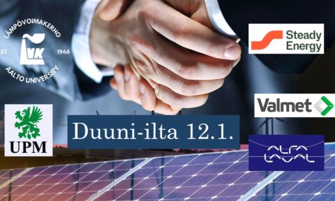 Onko kesätyöpaikka hakusessa? Mietityttävätkö diplomityömahdollisuudet? Haluaisitko tehdä osa-aikaistöitä opiskelujen ohella? Lämpövoimakerho järjestää ensimmäistä kertaa energiatekniikan opiskelijoiden duuni-illan Design Factorylla 12.1. klo 16:30 alkaen, jonne voit tulla kuuntelemaan yritysten esittelyt, verkostoitumaan ja hankkimaan arvokasta tietoa rekrytoinneista! Mukana duuni-illassa ovat UPM, Steady Energy, Alfa Laval ja Valmet.