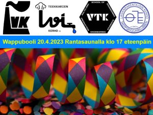 Wapun lähestyessä legendaaristakin legendaarisempi Wappubooli pärähtää jälleen! LVK, Teekkarien LVI-kerho, LRK ja VTK tarjoavat jäsenilleen tänäkin wappuna boolia, ruokaa ja mitä mainiointa wapputunnelmaa! Saavu siis torstaina 20.4.2023 klo 17.00 alkaen Rantasaunalle ja varaudu wapun tärkeimpään tapahtumaan – tätä et halua missata! Juhlakansan iloksi myös rantsun sauna ja palju lämpenee.